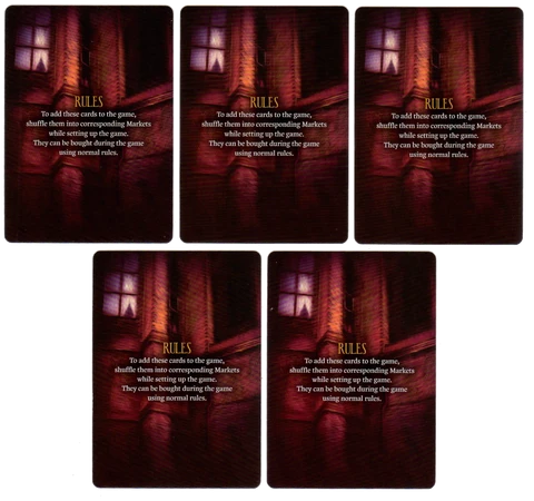 Rules: To add these cards to the game, shuffle them into corresponding markets while setting up the game. They can be bought during the game using the normal rules.
