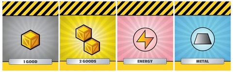 A set of four 9x10cm drawstring bags designed to fit within the existing game insert for the game Fantastic Factories. These four bags are designed to hold the energy tokens, metal tokens, 1 goods tokens, and 2 goods tokens.