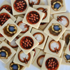 Just as chocolate was an integral part of Mayan culture and commence, so too will these GeekUp bits become essential to your play of the game Teotihuacan! These two-sided bits feature additional artwork from the game’s original artist, Odysseas Stamoglou, on one side and an engraving of the Mayan glyph for cacao on the other.