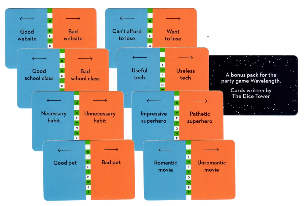 A pack of 8 new cards (and 1 title card) for Wavelength, created by the Dice Tower team!
